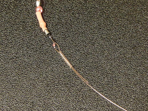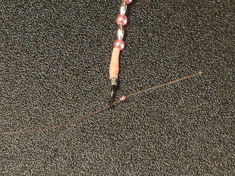 @ ハリス部へ補強用パイプを通し、先端約3cm程残してあらかじめコブを作っておく。