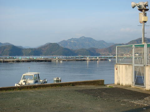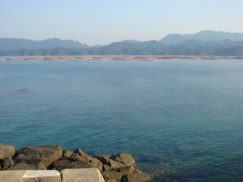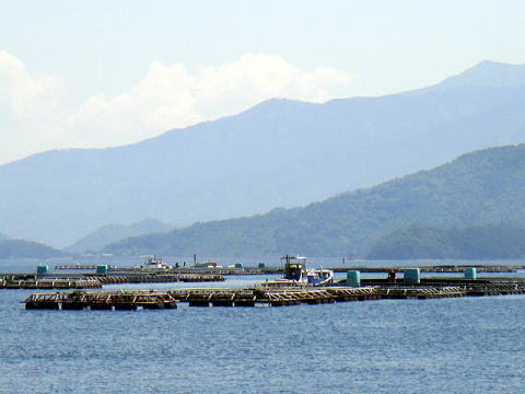 “真珠”の養殖に使う母貝「あこや貝」の養殖棚で、だいたい近くに魚の養殖イケスがある場合は真珠の