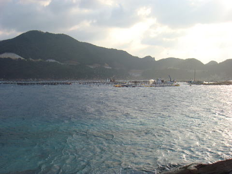 早朝やお昼過ぎにクレーンの搭載した漁船がイケス横にやってきて何やら作業をしている、、、
