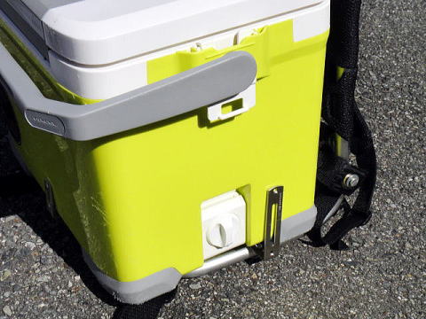 ご覧のよ〜にクーラーも磯クールも取り付けたステンレスステーによって背負子上にがっちりホールドされている