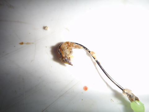 夜戦中に回収した仕掛け、針にかろうじて残っている虫エサの破片、、、
