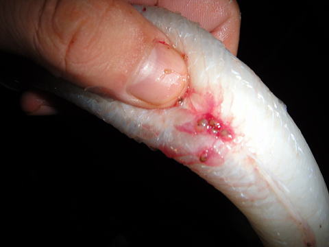 だから撃沈した魚のお腹辺りがコバルトブルーに光っていたら要注意!熱を通せば死滅しますし、まだこの段階では