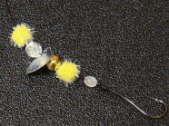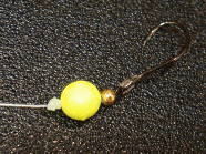 ● 蛍光イエロー発泡シモリ1号 → ゴールド丸ビーズ中 → 針