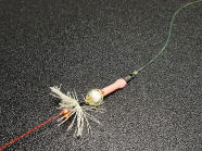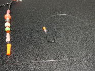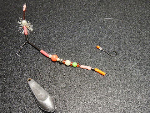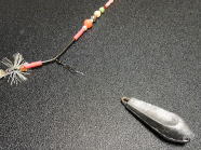 ● ビーズ類で飾ったド派手な天秤+ショートハリスでババガレイにアピール